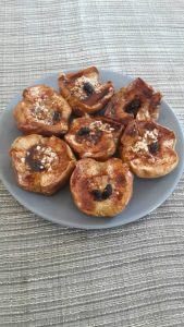 רכיבים: 6 תפוחים אדומים 12 כפיות שיבולת שועל חופן צימוקים 8 כפיות סוכר חום מעט קינמון לפיזור אופן ההכנה: חוצים